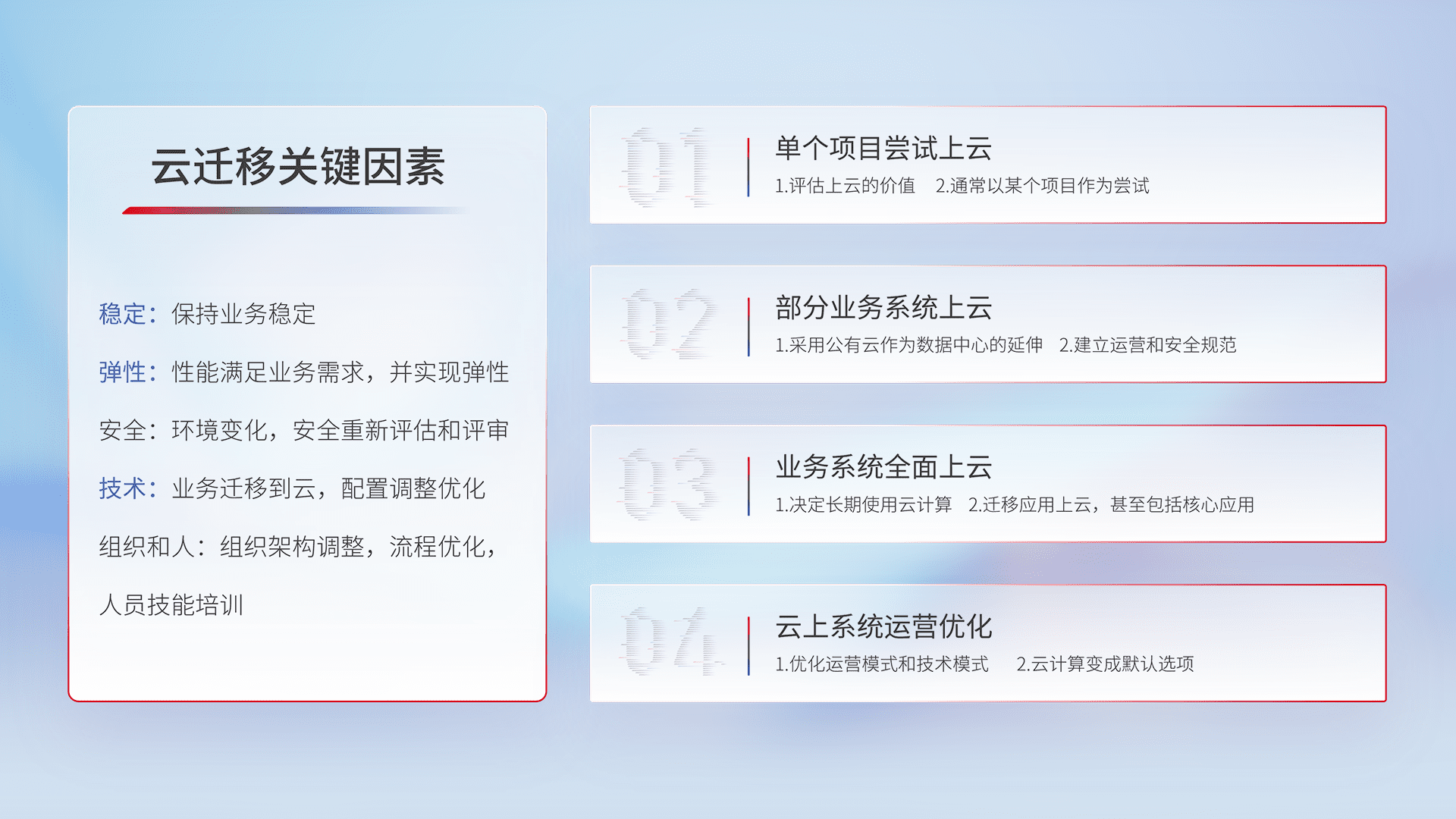 结合实际业务,,,从规划设计、、、、云平台选型、、、、云原生改造、、、数据迁移、、集成交付,,迁移全过程为客户识别最佳上云路径,,,,做好风险识别管理,,,设计网络架构、、身份权限、、、安全审计合规、、、、操作审计、、、、日志审计、、、监控告警策略、、、多站点容灾设计等,,,,对云上基础设施进行整体规划,,,,提升IT治理水平,,,,以满足弹性、、、、高可用、、高性能的需求。。。。