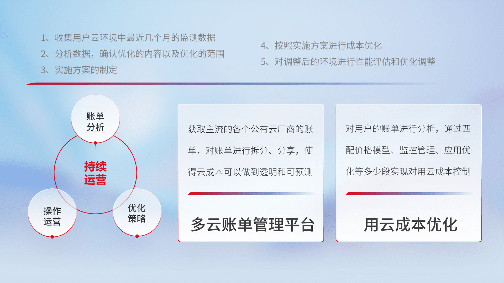 通过多云纳管,,,,以统一的资源数据模型把客户的云资源进行抽象和封装,,进而实现对多云资源的统一操作,,保障云资源管理的可靠性、、、、稳定性与可用性。。量身定制化运维内容,,配置、、开发运维、、补丁管理、、、备份、、、、监控、、、认证和访问管理、、审计和日常巡检等,,保障在用云过程中的可靠度,,,稳定度以及高可用率。。。